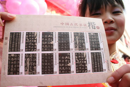 A model displays stamps made of "traditional Chinese calligraphic paper" in Changge, Central China's Henan Province on November 5, 2007. Instead of using commonly-used postage stamp paper, the stamps are the first ever set of stamps made of calligraphic paper by China Post. [newsphoto]