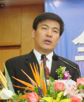 Luo Qiang, mayor of Dazhou, Sichuan Province, speaks at the National Sulfur-related Chemical Industrial Forum held in Dazhou Sunday, April 20, 2008. [photo by Mei Chao]