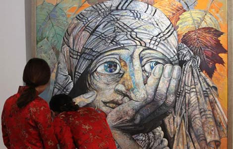 Visitors enjoy artwork at the first "Russian Art Week" in Nantong, Jiangsu province, May 28, 2014. 2014 is a cultural exchange year for Chinese and Russian youth. The art week will exhibit over 200 modern and contemporary oil paintings, woodcuts and photographs showcasing Russia's local customs, among which the earliest work can be traced back to 1924. The event will run through June 16 at 1895 Nantong Culture and Creative Industry Park. [Photo/Xinhua]