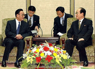 China's No. 2 leader Wu Bangguo, left, talks with Kim Yong Nam, head of the Presidium of the Supreme People's Assembly, in Pyongyang on Wednesday October 29, 2003. Earlier Wu flew into the North Korean capital on a 'goodwill visit' to North Korea as efforts mount to convene a second round of six-nation talks on the nation's nuclear program. [AP]