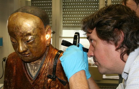 A researcher studies a hole in the ear of a Buddha statue dating to the 11th or 12th century at the Drents Museum in the Netherlands. [Photos provided by the Drents Museum] |