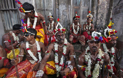 Hindu holy men sit as they take a break from a religious procession to mark the Gajan festival in Kolkata April 12, 2012. Devotees offer prayers during the month-long festival in hopes of winning the god's favour and ensuring fulfilment of their wishes, as the festival ends on the last day of the Bengali calendar year on April 13. [Photo/Agencies]