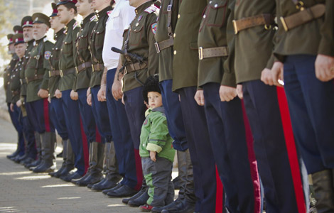 A dog wearing sunglasses sits at Plaza Independencia Square in Montevideo, Dec 18, 2012. [Photo/Agencies]
