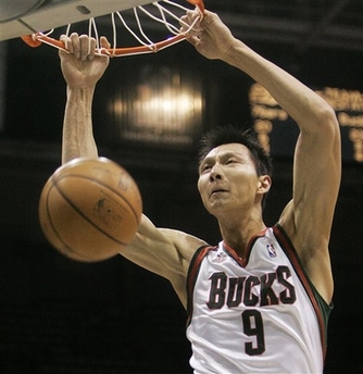Milwaukee Bucks' Yi Jianlian, of China, dunks during the second half of a NBA basketball game against the Philadelphia 76ers,Tuesday, Nov. 27, 2007, in Milwaukee. The 76ers won 114-99. [Agencies]