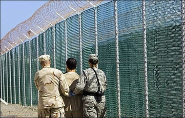 A detainee is escorted by military guards inside Camp Delta's