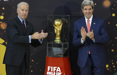 US Secretary of State John Kerry (R) applauds as Vice-President Joe Biden jokes that he is going to pick up the recently-unveiled FIFA World Cup Trophy, at the State Department in Washington, April 14, 2014. The event is the first US stop for the trophy tour, preceding the World Cup Tournament in Brazil this summer. [Photo/Agencies]