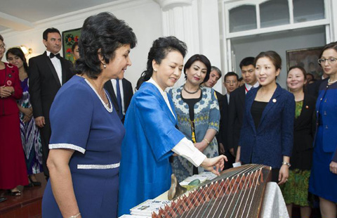 China's first lady Peng Liyuan demonstrates a guzheng, a traditional Chinese stringed instrument she donated to a Tajikistan music institute during her visit to Dushanbe on Friday.